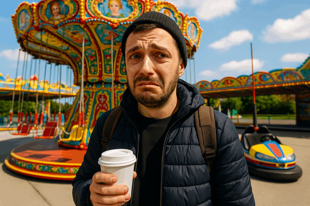 Første ting: karuseller! Ja, du vet, de som svinger og vrir. Jeg sa til meg selv: “Jai, do ikke være dum!” Men der var jeg, som en svevende fjær i vinden – skriker som en liten fugl.